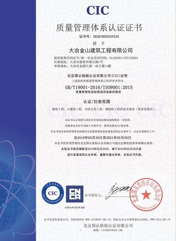 質量管理體系認證證書...